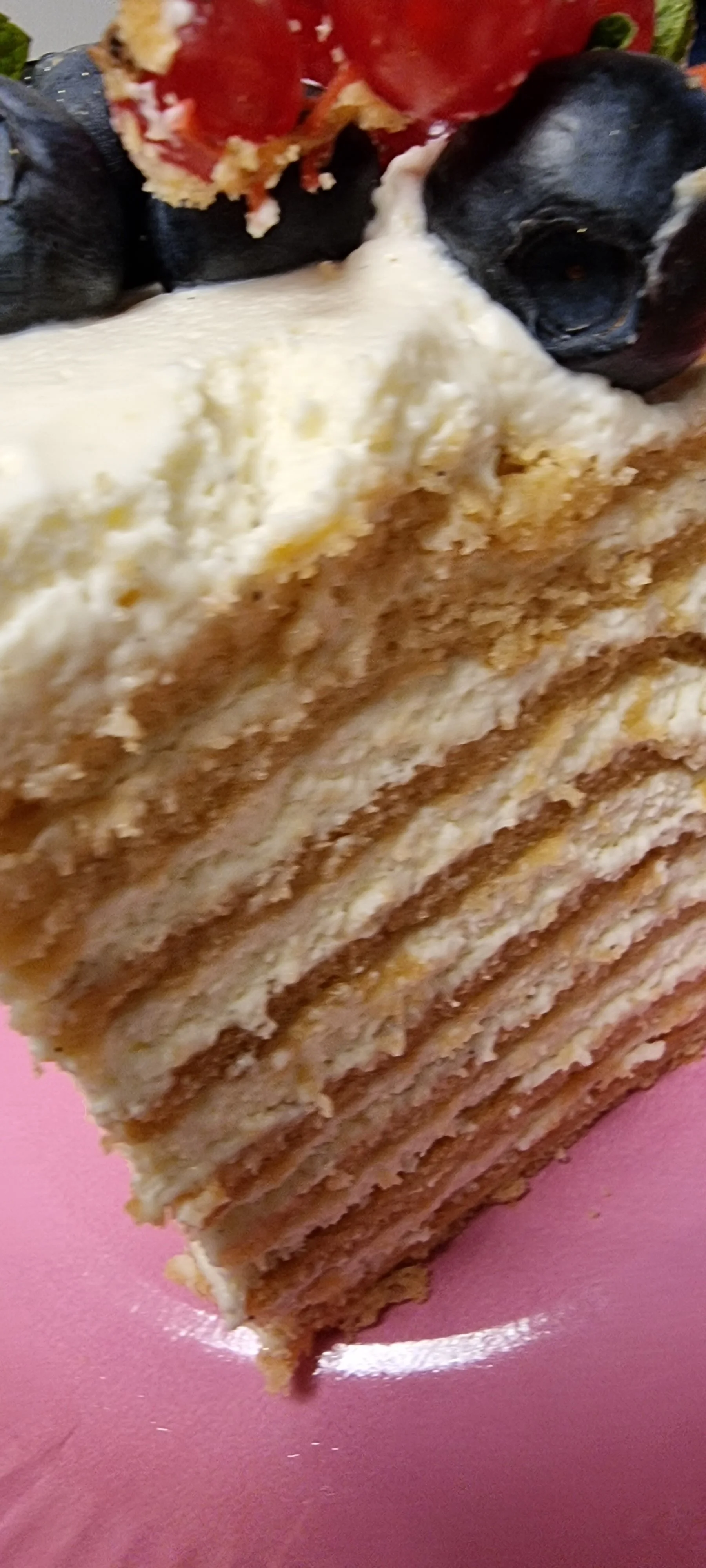 Ein klassisches hausgemachtes Dessert aus dünnen, aromatischen Honigböden, durchzogen von einer zarten Sauerrahmcreme.
