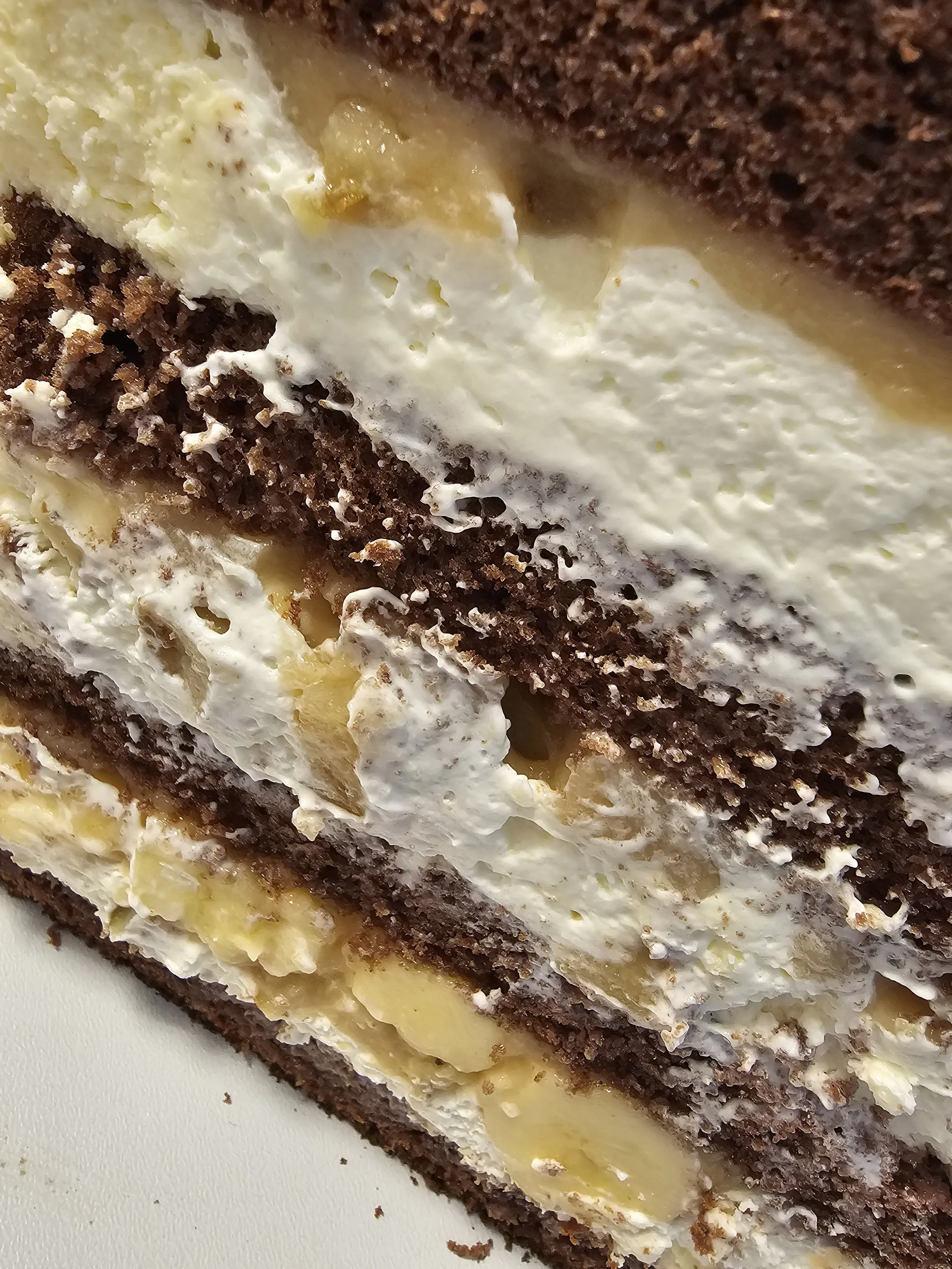 Schokoladenbiskuit kombiniert mit einer zarten Vanillecreme und aromatischen karamellisierten Bananen.