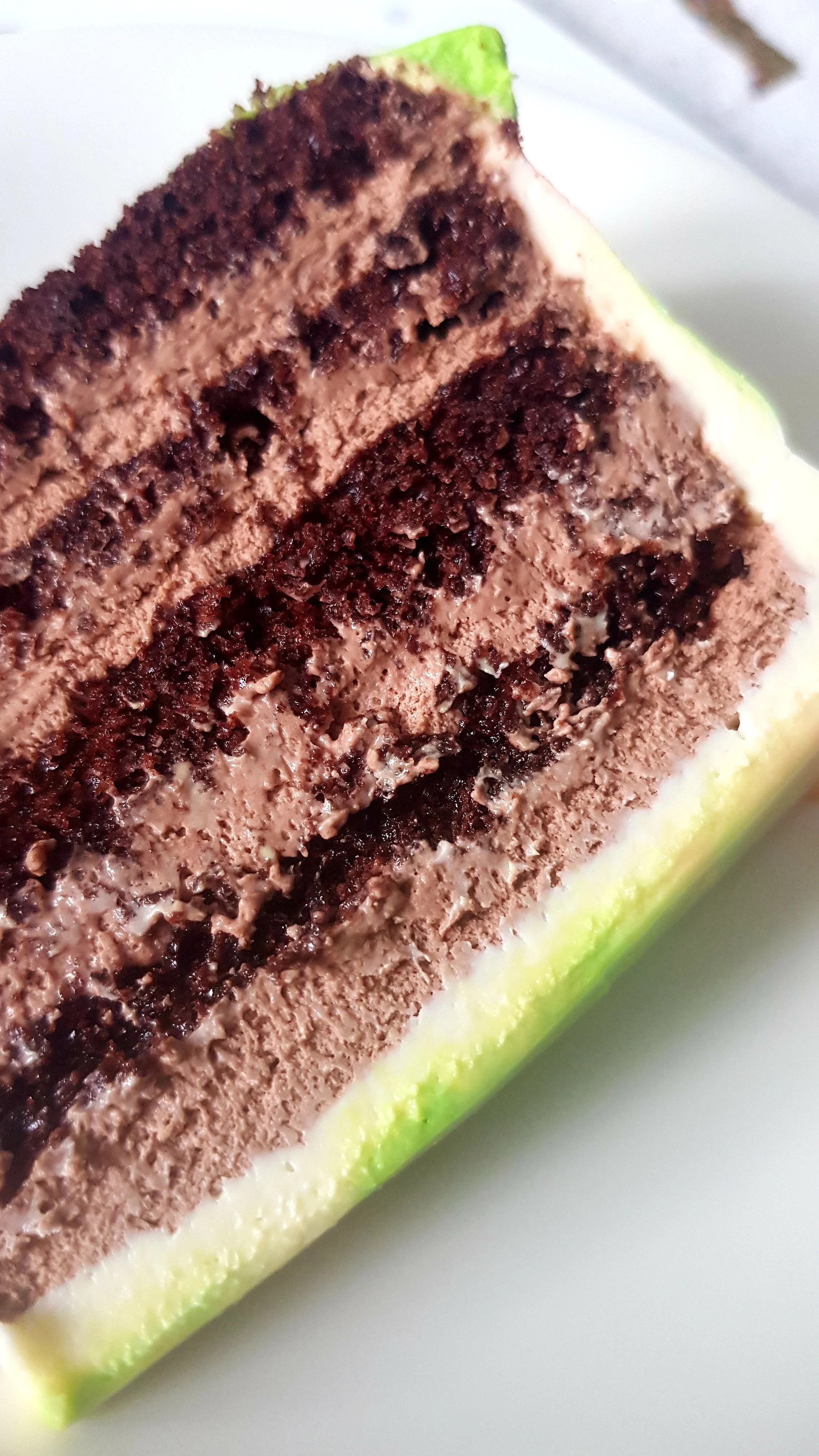 Zarter Schokoladenbiskuit, getränkt und geschichtet mit einer luftigen Schokoladencreme.