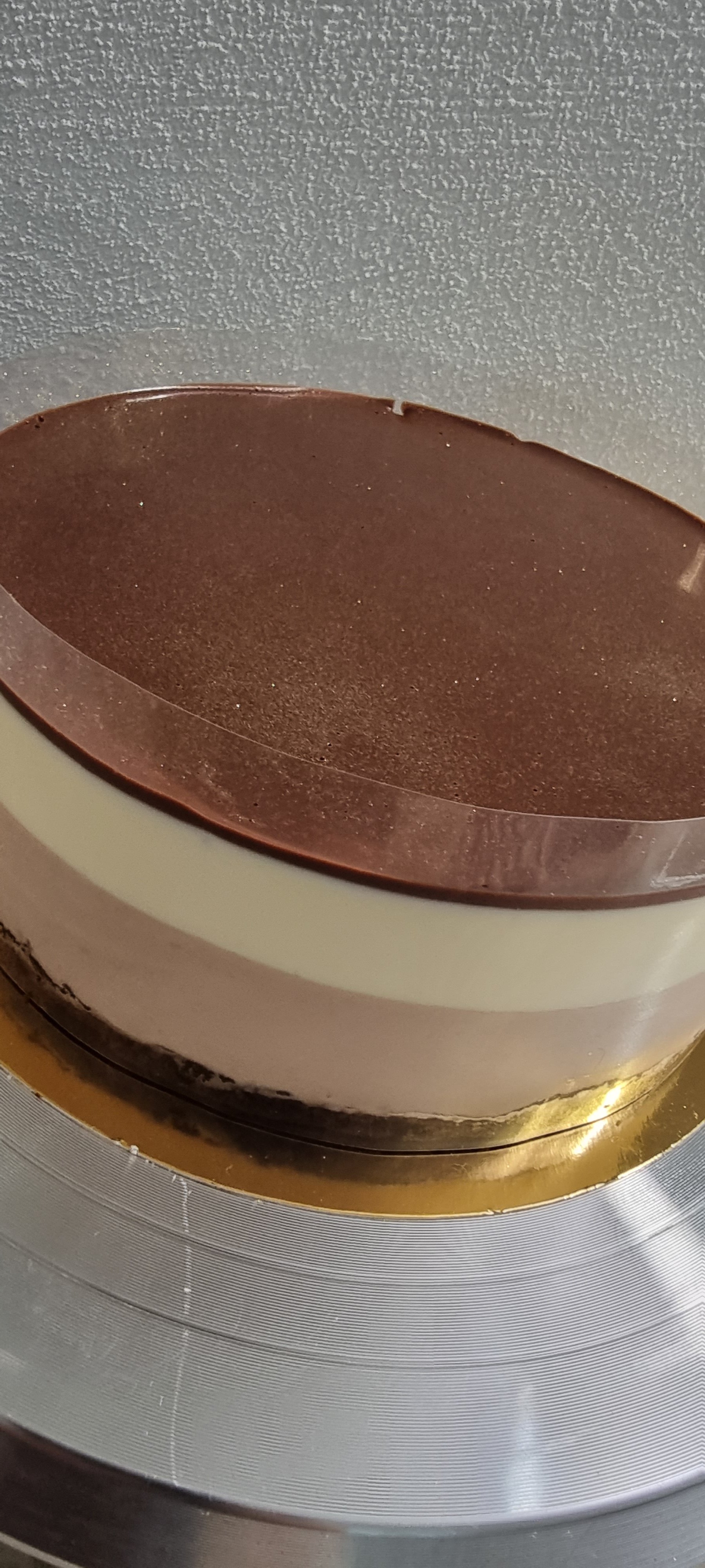 Eine exquisite Mousse-Torte mit drei Schichten: Weißer-, Milch- und dunkler Schokolade.